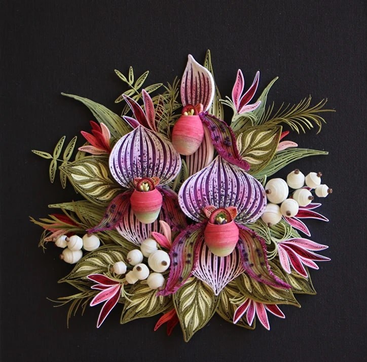 Анастасия- художник, которая создаёт цветочные композиции в технике квиллинга- картины из скрученных полосок бумаги, склеенных по краям.