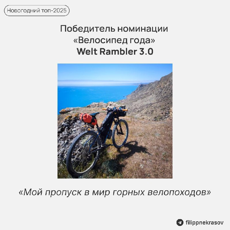 И победитель в номинации "Велосипед года" - хардтейл Welt Rambler! В этот раз всё просто и очевидно. Этот аппарат - главный проводник в эмоциях и местах 2025 года. Почему именно он?! 1. Новые ощущения от велосипеда. После столькоих лет фиксов, гравийников и АТБ сесть на современный хардтейл - это как заново открыть велосипед. Управляемость, работа вилки, посадка - новые ощущения. 2. Испытан в огне и воде (точнее, в камнях и ветре). Прошёл два абсолютно разных трипа: - Крым, где он раскрылся на 100% на трейлах и подъёмах. - Рыбачий, где выдержал проверку на прочность в жёстких северных условиях. Разный рельеф, разный климат - один результат: восторг и успешное прохождение маршрута. 3. Готовность из коробки. По сути, собрал и поехал. Из изменений только - бескамерные покрышки и родная база: седло, педали, грипсы. Никаких доработок. В итоге - это тот самый инструмент, на котором я проехал сотни километров, увидел полярные пейзажи и крымские вершины, и который ни разу не заставил усом