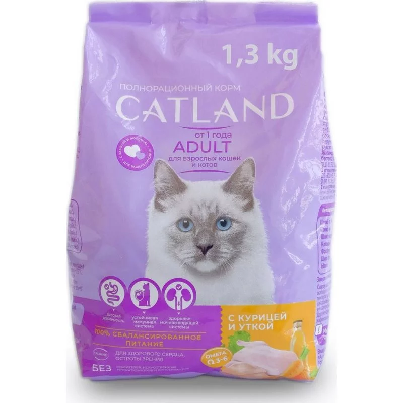 - Catland для взрослых кошек (курица и утка). Базовая формула для активных взрослых питомцев от 1 года.