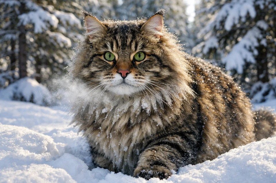 Но истинная гордость и главный инструмент выживания сибиряка — это его шерсть. Она уникальна и состоит из трёх типов волос. Первый — плотный, водонепроницаемый покровный волос, длинный и жёсткий, отталкивающий влагу. Второй — обильный, густой остевой волос. И третий, самый важный для терморегуляции, — нежный, пуховый подшёрсток, который набивается невероятно плотно, особенно в зимний период. Именно этот подшёрсток создаёт воздушную прослойку, не выпускающую тепло тела. Шерсть сибирской кошки обладает удивительным свойством: она не пропускает воду и практически не намокает. После прогулки по мокрому снегу кошке достаточно отряхнуться, и её шубка вновь станет сухой и пушистой. Линька у этих кошек сезонная и очень выраженная: к лету они «сбрасы»ют значительную часть подшёрстка, становясь более лёгкими, а к зиме вновь «одеваются» в роскошную тяжёлую шубу.
