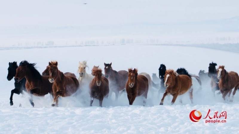 На бескрайнем снежном поле в уезде Чжаосу /Монголкюре/ Или-Казахского автономного округа Синьцзян-Уйгурского автономного района – «родине скакунов Китая» – небо и земля сливаются воедино. Нет здесь ничего, кроме вольного ветра, безмолвия и этих могучих лошадей. Табун вольных скакунов несется вперед, вздымая вихри алмазной пыли.