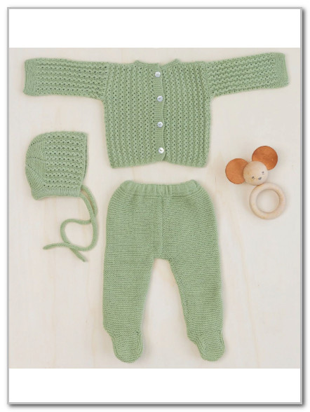 Четыре полезных и практичных изделия для малыша, фисташкового цвета - кофточка с застежкой на спинке, шапочка с завязками, высокие пинетки с узором и штанишки-ползунки на резинке. Штанишки вяжутся в 2 частях: левая и правая штанина, начиная от подошвы, платочной вязкой до пояса.