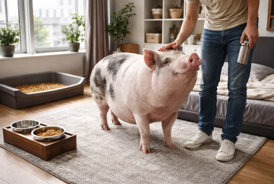Безопасность и перепланировка: Мини-пиг — любопытное и умное существо, которое будет исследовать всё носом и ртом. Необходимо убрать все провода с пола, бытовую химию, комнатные растения (многие ядовиты), хрупкие предметы. Свиньи плохо ориентируются на скользких поверхностях — паркет, ламинат, линолеум становятся для них катком, что грозит травмами суставов и позвоночника. Требуется покрытие коврами или специальными матами. Лестницы в многоуровневых квартирах — опасное препятствие.