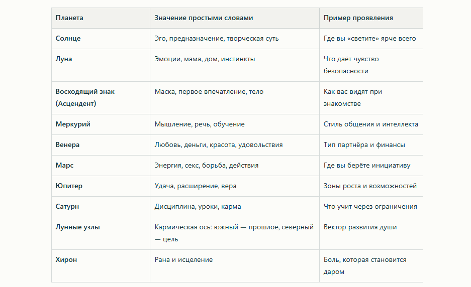 - Большая тройка: Солнце (суть), Луна (эмоции), Асцендент (маска).