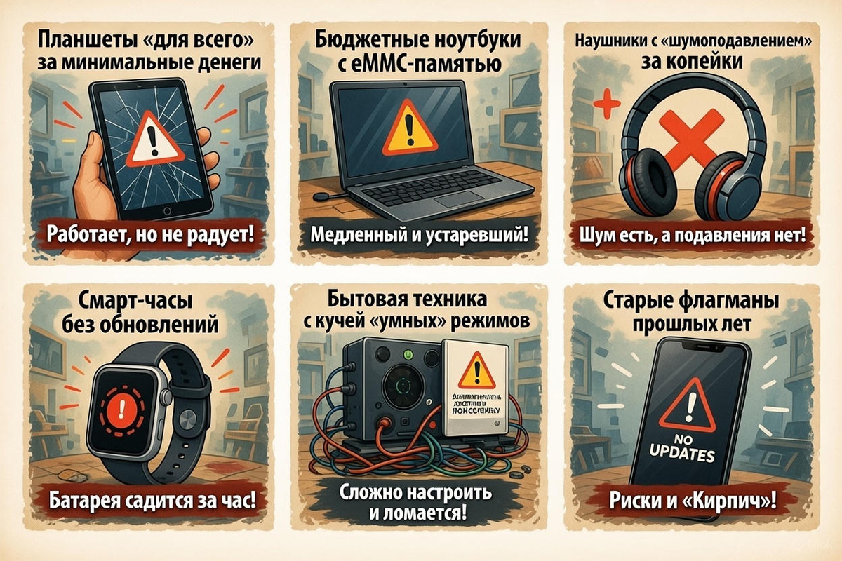 Но есть устройства, которые выглядят разумным выбором, а на деле разочаровывают уже через несколько месяцев. Вот ещё список техники, которую в 2026 году лучше обходить стороной, даже если цена кажется подарком. Обычно их покупают с мыслью: «И кино посмотреть, и поработать, и детям дать» Реальность: Через 3–6 месяцев: Если нужен планшет: Один из самых недооценённых минусов. eMMC: Что происходит: В 2026 году только SSD, даже в бюджетном сегменте.