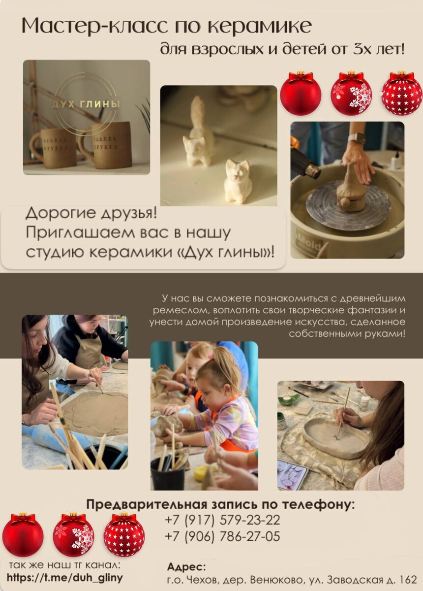 ?🎄🎄🎄 Приглашаем вас посетить мастер-класс по ручной лепке из глины и занятия на гончарном круге для взрослых и детей от 3х лет! 🎉🎉 Что входит в мастер-класс? 1. Занятие лепкой за столом под руководством нашего мастера в группах до шести человек 2.Парные занятия на гончарном круге 3. Изготовление 1-2 изделий (зависит от сложности) 4. Покрытие изделий цветными красками (ангобами). 5.Продолжительность МК 1,5 часа 6. Уютная атмосфера (чай/кофе, хорошая музыка и домашняя обстановка ) Предварительная запись по телефону: 8 (917) 579-23-22, +7 (906) 786-27-05, Адрес: г.о. Чехов, дер. Венюково, ул. Заводская д. 162