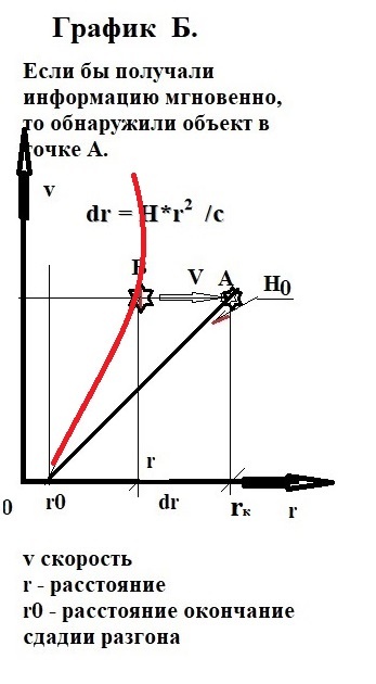 Рассмотрим график Б. Если бы мы получали мгновенно информацию о скорости, и расстоянии от объекта, то его мы бы обнаружили в точке А. Но информация до нас доходит со скоростью света, а значить, мы получим её из точки В. Пока свет от этой точки дойдёт до наблюдателя пройдёт время t = r/ c, ( Где r – расстояние, с которого мы сняли информацию, c – скорость света.), объект удалиться на расстояние: