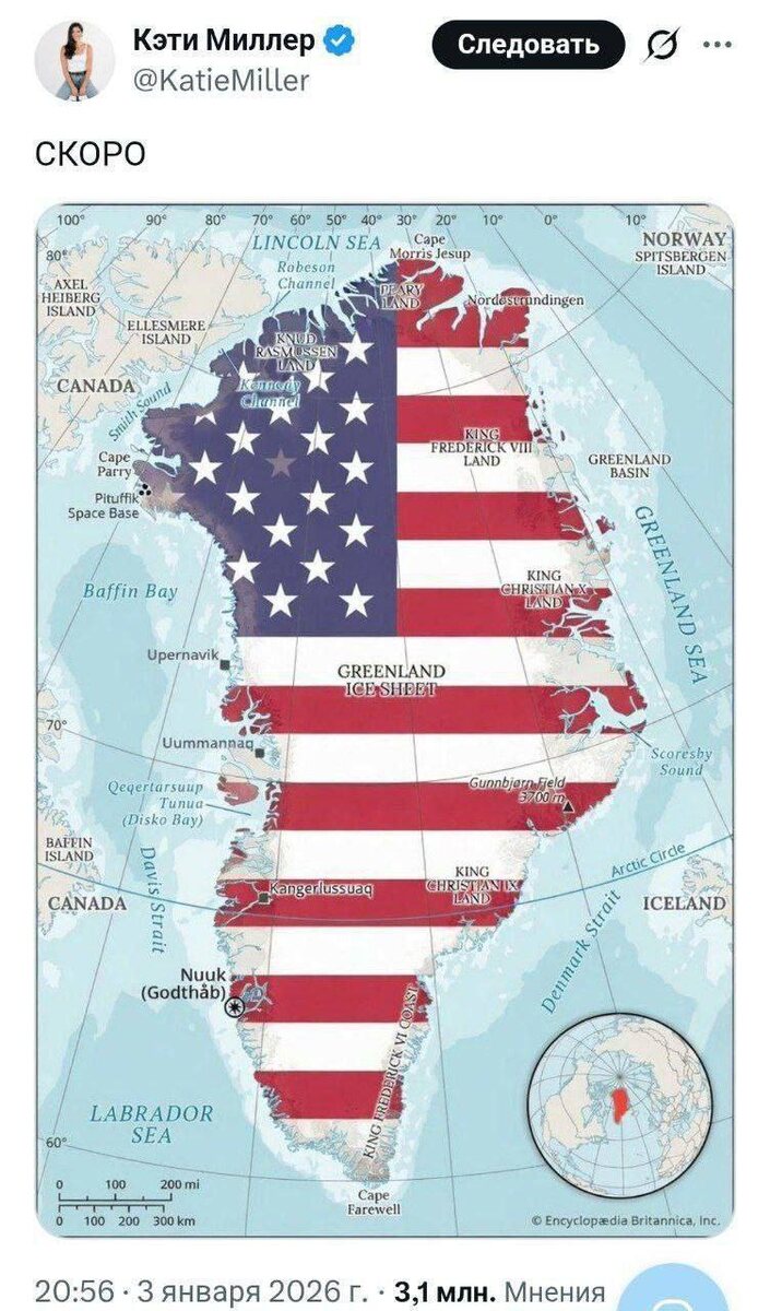 Как бы еще Гренландии не досталось((( Фото карты Гренландии в цветах флага США и с подписью «Скоро» опубликовала жена замглавы администрации Трампа Кэти Миллер.