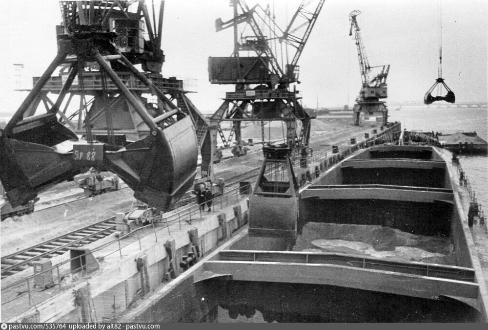 Разгрузка теплохода, груженого гравием 📍 Волжская набережная, Нижний Новгород, Россия 📅 Примерно 1965 год 📱 Ещё больше фото в Telegram: [t.me/shipstories] #ГорьковскийПортРазгрузка #Историяфлота #PastVu
