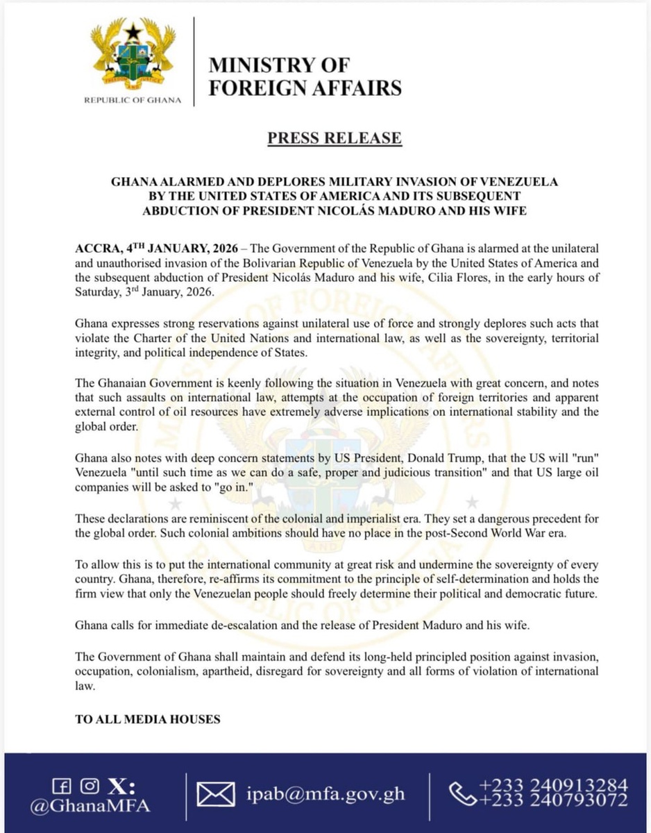 Ghana ALARMED and DEPLORES US 'military INVASION of Venezuela' Deeply concerned by Trump’s statement that US will 'run' Venezuela: 'reminiscent of COLONIAL and IMPERIALIST era' Urges release of Maduro and his wife — Russian FM has also called for their immediate release