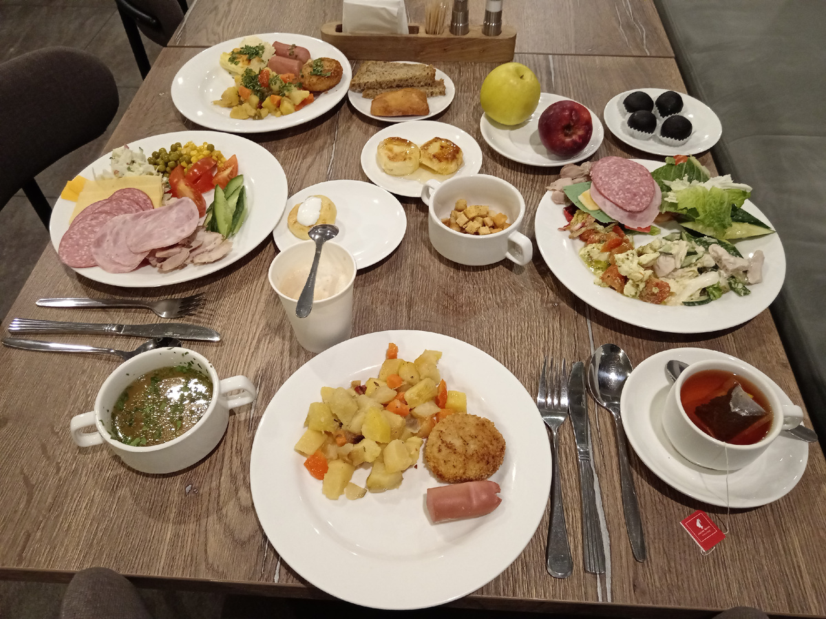 Меню тоже самое. Но все довольны шведским столом. Кто-то ограничивается кирпичиком омлета и чашечкой кофе. А кто-то основательно завтракает как мы. У нас сегодня довольно плотный график.