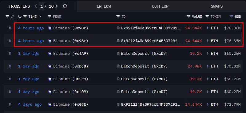 π Bitmine Π΄ΠΎΠΏΠΎΠ»Π½ΠΈΡΠ΅Π»ΡΠ½ΠΎ Π·Π°ΡΡΠ΅ΠΉΠΊΠ°Π»Π° 49 088 $ETH Π½Π° ΡΡΠΌΠΌΡ 152,7 ΠΌΠ»Π½ ββΠ΄ΠΎΠ»Π»Π°ΡΠΎΠ²