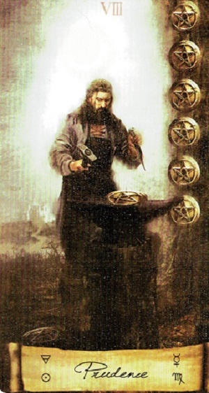 После периода терпеливого ожидания и сомнений Семёрки наступает время, когда нужно вновь взять инструменты в руки, но уже не для начала нового дела, а для оттачивания мастерства, рутины и кропотливой работы. Созревание завершено, начинается фаза обработки. Встречайте — Восьмёрку Пентаклей.