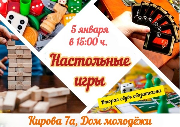 ! Завтра, 5 января, в Доме молодёжи мы устраиваем день настольных игр! Приходите провести время в компании единомышленников, поиграть в любимые игры и познакомиться с новыми людьми. Начало в 15:00. Не забудьте взять с собой вторую обувь! Ждем вас! Будет весело! Источник https://uchaly102.ru/?p=119151