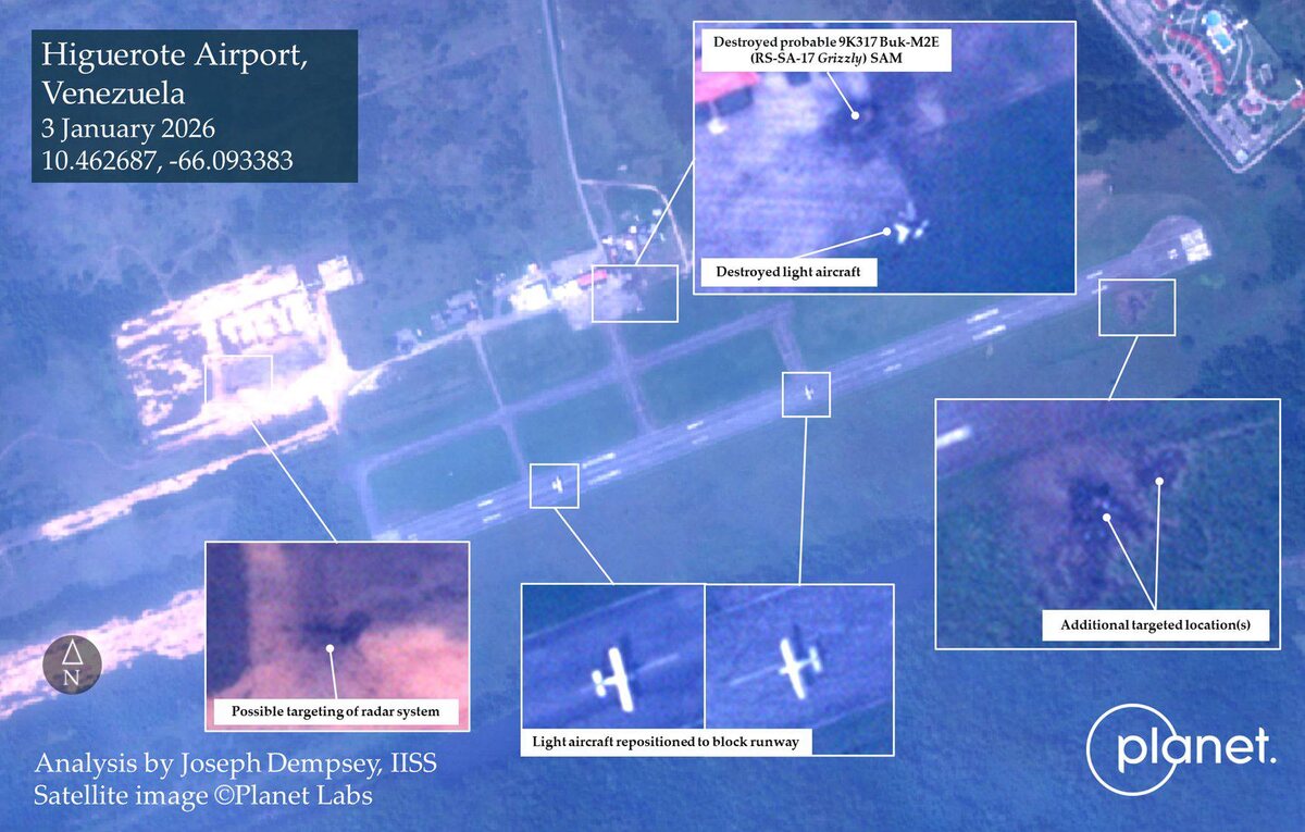 Спутниковый снимок в низком разрешении аэропорта Игуэроте, расположенного в штате Миранда на северном побережье Венесуэлы. На снимке видны: ▪️Уничтоженный, предположительно, командный пункт 9С510Э из состава ЗРК «Бук-М2Э». ▪️Предположительно, уничтоженная РЛС. ▪️Неясные следы попаданий около ВПП. Вероятно, удар по позиции ЗРК, либо же промах. ▪️Два легкомоторных самолёта, которыми была перегорожена взлётно-посадочная полоса. Похоже, что венесуэльцы действительно опасались повторения Гостомеля с захватом своих аэродромов и последующими планами по приему военно-транспортных самолетов с десантом и техникой. Однако, вся операция США ограничилась только кражей Мадуро с сопутствующим пробиванием коридора в ПВО и отвлекающими ударами. Военный Осведомитель