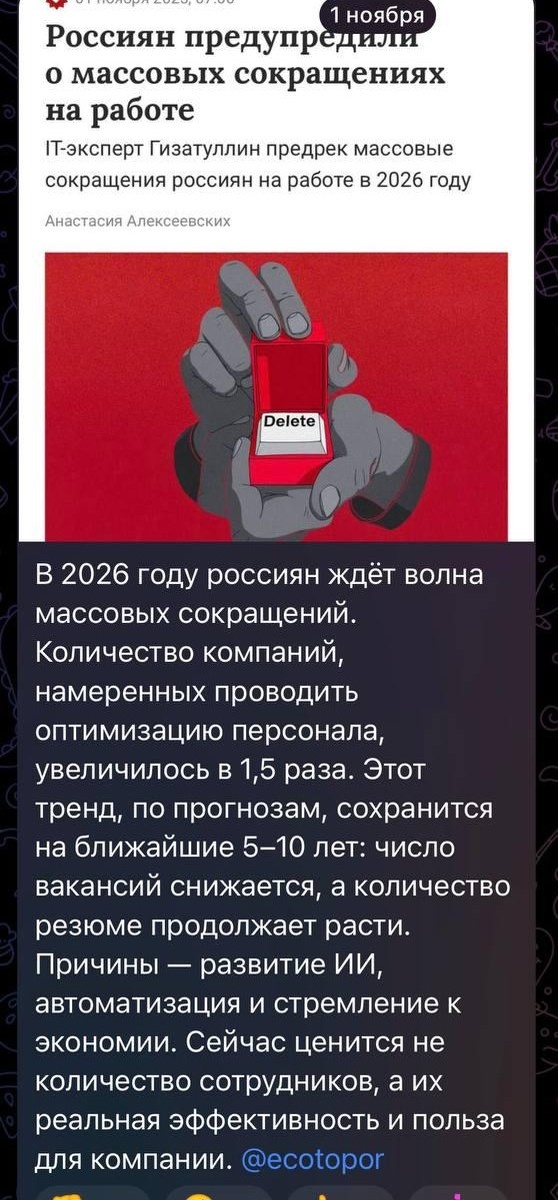 Давайте вместе разбираться, есть ли в найме стабильность? Я думаю, что и да, и нет. И вот почему: С одной стороны, вы в штате и каждый месяц приходит зп. С другой стороны, в любой момент это может закончиться ▪️ Сокращения ▪️ Банкротство ▪️ Автоматизация процессов через ИИ (Уже сейчас им начинают заменять отдельных людей и отделы. Не где-то там, а в Москве. Думаю, скоро это дойдет и до регионов) По ощущениям в 2026 году и в ближайшие 10 лет выиграют те, кто подстелил себе соломку. И нашел возможность самому создавать себе работу, независимо от того, что происходит в мире Я сама работала в найме в фитнес-центре и ушла оттуда. А через пару месяцев сетку закрыли и уволили всех. Не потому что они плохие работники, а потому что компания обанкротилась И нет, я не против найма. Считаю, что это хорошая стабильность, на которую можно опереться, пока она есть Но еще я за то, чтобы жизнь не крутилась только вокруг одного источника дохода. И всегда был запасной аэродром, который генерирует доход