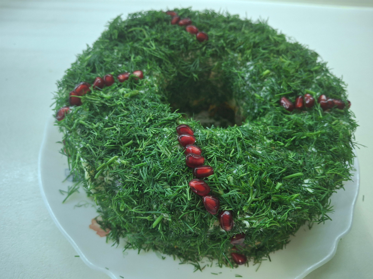 - сыр твердый – 200 грамм; - майонезом - зелень укропа; - зерна граната. Приготовление: Выкладывать кругом с дыркой внутри (в виде кекса). Берём кольцо а в середину ставим рюмку. Выкладываем по кругу