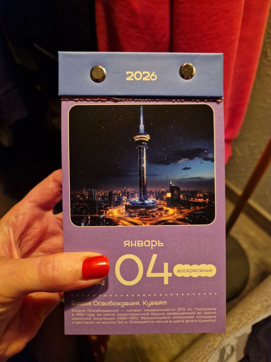 Сегодня у меня появились вопросики к календарю, точнее к ИИ, который явно был использован при его составлении. Башня Освобождения, что на сегодняшней страничке календаря как будто отличается от той, что нашла на просторах интернета. Сама в Кувейте я не была, посему личными данными по этому вопросу не обладаю, но как будто врёт немного календарь 🙈 если вы были и видели вживую, поделитесь мнением. Но а пока про саму башню. Башня Освобождения — это символ победы Кувейта над оккупацией Ираком. Строительство началось до вторжения Ирака и завершилось после освобождения страны. Интересно, что Башня Освобождения не всегда носила это имя. Изначально в 1990 году ее начинали возводить под названием «Телекоммуникационная Башня Кувейта». Нынешнее, более символичное название, она получила уже после завершения строительства в 1996 году. Возвышаясь на 372 метра, она не только входит в число самых высоких телекоммуникационных башен мира (если вдаваться в подробности, то сия башня на 13 месте среди сам