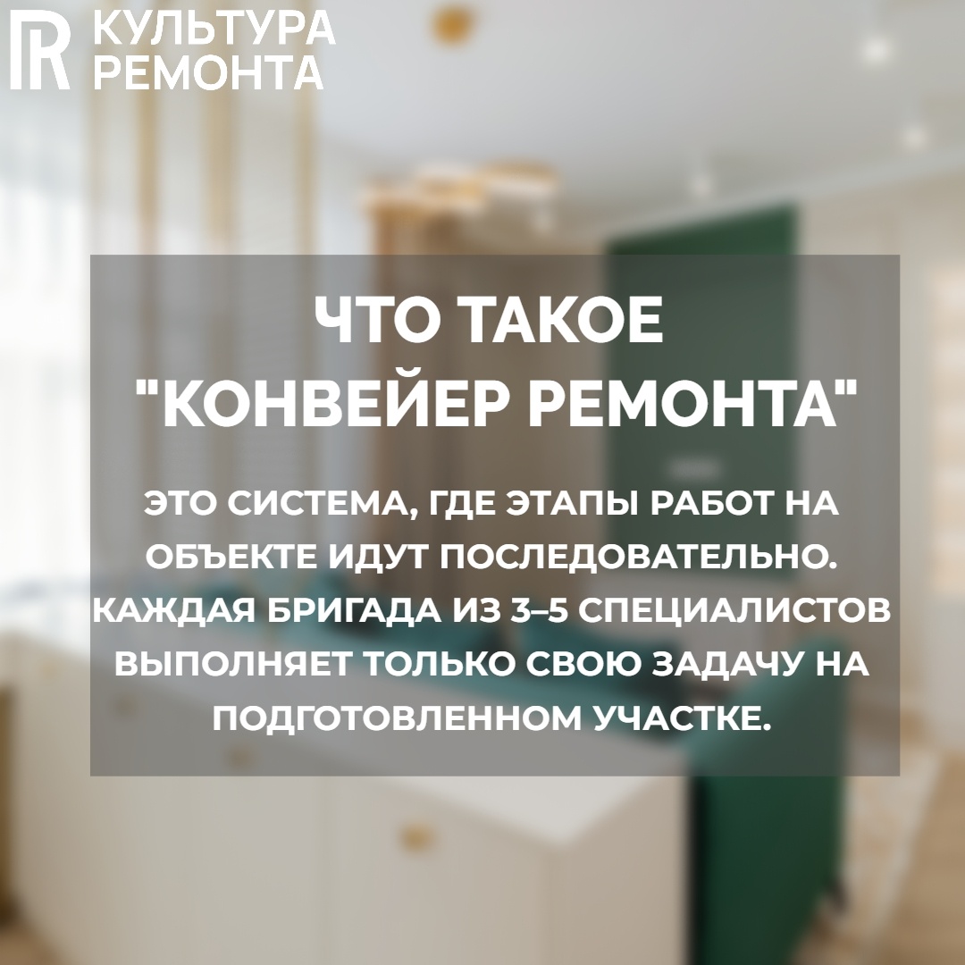 «Конвейер» обеспечивает непрерывность и преемственность работ на объекте. 2. Это непрерывность процесса, узкая специализация бригад 3. Это ответственность за качество свое работы перед коллегами и заказчиком 4. Это постоянное оттачивание мастерства и рост профессионализма от объекта к объекту. Хотите узнать, с чего начинать ремонт и сколько это стоит? Заполняйте нашу анкету на расчет стоимости: https://vk.com/app5619682_-218627387#684661 Отделочная компания «Культура ремонта» — дизайн интерьера и отделка квартир «под ключ» в Нижнем Новгороде.