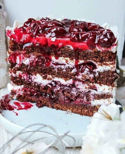 Бисквит разрезать на 3-4 части,на первый выкладываем крем по краям,оставляя в центре место,выкладываем туда вишню,сверху прикрываем вторым коржом и делаем то же самое☺🍒