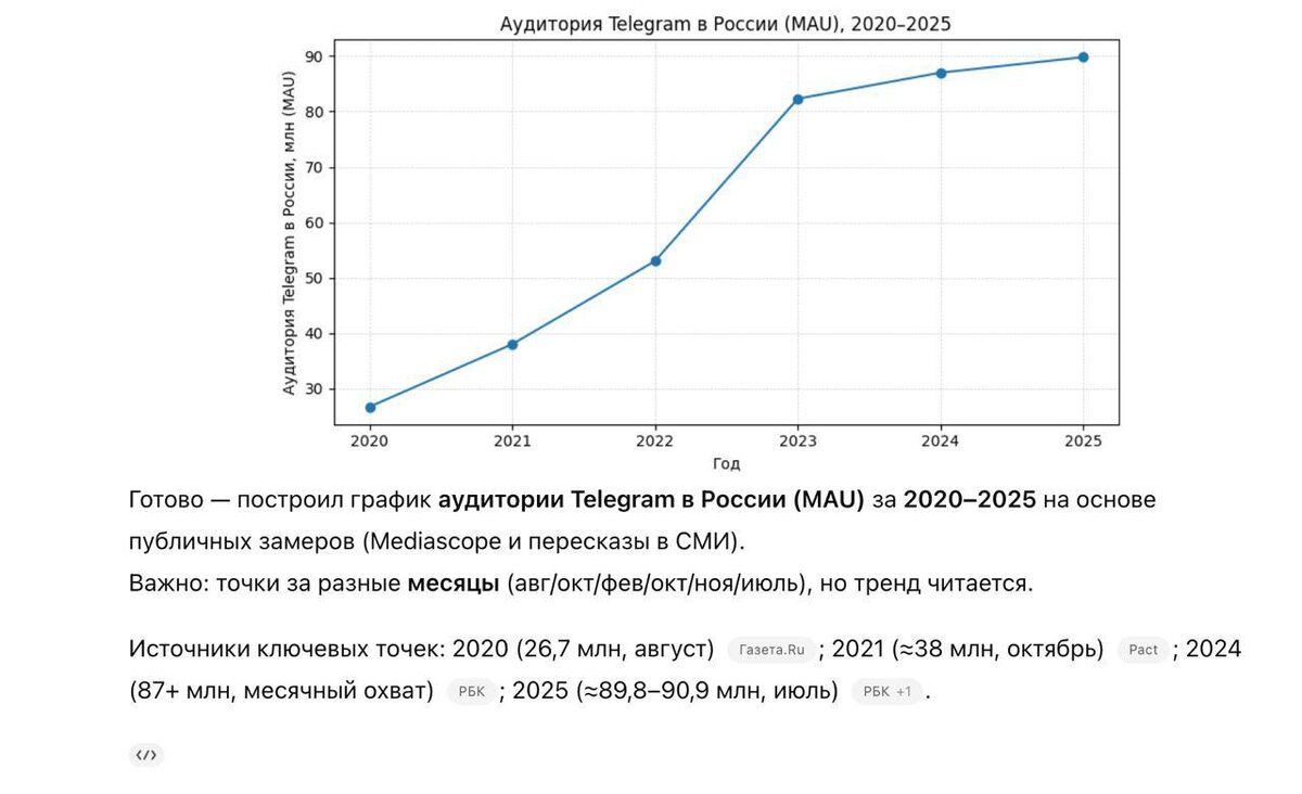 Этот канал я создал в 2022 году, а действительно начал вести его только летом 2025-го. С 2020 по 2025 год аудитория Telegram в России выросла в 3 раза и сейчас составляет почти 100 млн человек (график 1). При этом экономически активное население страны — около 76 млн. Т.е. значительного роста аудитории Telegram в России уже не будет. За тот же период количество каналов на площадке увеличилось в 10 раз (График 2). Т.е. подписчики будут дорожать, увлечь их будет еще сложнее, а конкуренция станет жёстче. Но сейчас альтернатив Телеграму объективно нет. Так что двигаемся дальше — нарабатываем навыки, аудиторию и зарабатываем деньги. На 2026 год я ставлю себе цель: создать флагманский продукт, который буду продвигать через этот канал. В рамках этой цели я: - опубликую более 300 постов в этом канале; - сниму и опубликую более 100 видео; - проведу более 20 публичных выступлений; - ... Критерий выполнения: чистая прибыль от нового продукта и этого Telegram-канала - более 2,4 млн ₽. Думаю