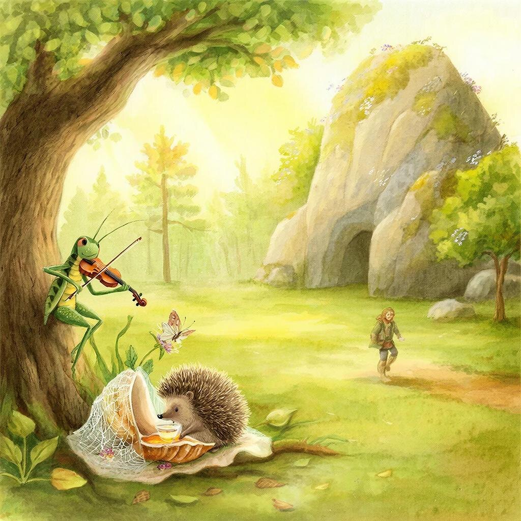 В одном старом-престаром лесу жили три друга: Сверчок, Ежик и Большая Скала. Они были дружны, неразлучны и очень любили друг друга, но каждый - по-своему. Сверчок любил громко. Каждый вечер он устраивал концерты под кроной раскидистого дерева. Он трещал веселые песенки, под которые хотелось танцевать даже сонным листочкам. Он обнимал друзей своими тонкими лапками и смеялся так заразительно, что даже молчаливая Скала, казалось, тихо улыбалась. Его любовь была как фейерверк - яркая, шумная и согревающая. Ежик любил тихо. Он никогда не трещал и не обнимал слишком крепко - у него были колючки. Но каждую ночь он приходил к Скале, заваривал в маленькой ракушке ароматный чай из лесных трав и укрывался лоскутным пледом из паутинок и мха. Сидя рядом, он тихо говорил: «Не забудь, Сверчок, уши в норке прикрой, сегодня роса холодная». Или: «Скала, я принес тебе новый мох, чтобы тебе было мягче». Его любовь была как тёплый плед - уютная, заботливая и верная. А Большая Скала... она просто была рядо