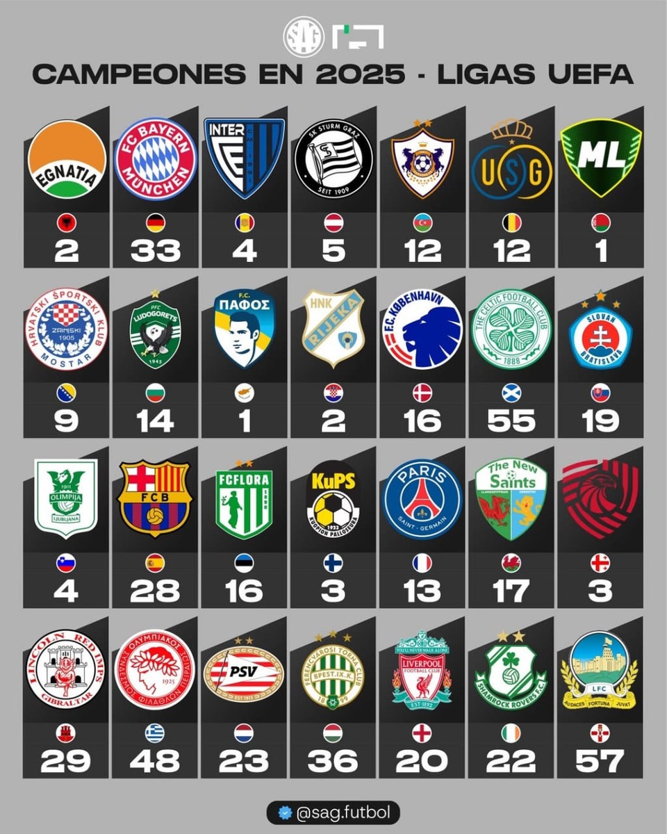 На картинках все победители европейских лиг, взявшие золото 25-м году, а так же количество их титулов. Наш Краснодар вошел в шестерку команд, победивших впервые в своей истории. Забавно, что из шести таких клубов сразу 4 из бывшего СССР. Кто-то может удивиться, что Жальгирис стал чемпионом Литвы впервые, но это команда не из столичного Вильнюса, а из Каунаса. Они попали в высшую лигу только 10 лет назад. Так же не удивляйтесь отсутствию чемпиона в Лихтенштейне. Всё-просто: там не проводится чемпионат, а команды из княжества участвуют в системе швейцарских лиг. Однако в стране проводится Кубок Лихтенштейна по футболу — единственное на высшем уровне клубное футбольное соревнование. Победитель участвует в Лиге Конференций. ⚽️ Подписывайтесь на нас в MAX