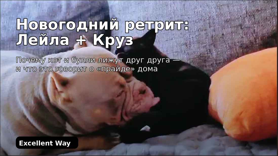 Новогодние каникулы — редкий момент, когда никто никуда не бежит, будильники сдались без боя, планы включают только отдых и развлечения. Дом переходит в режим замедления. И именно в этот момент у булли Лейлы и бурмы Круза начинается то, что мы между собой называем круглосуточный облизывательный ретрит. Диван, плед, любимая оранжевая подушка. И два существа, которые выглядят так, будто заехали в закрытый спа-курорт для премиум-персон. Все включено 24/7 в одном пакете "Новогодний Антистресс": Если смотреть глазами зоопсихологии, объяснение происходящему здесь очень приземлённое.