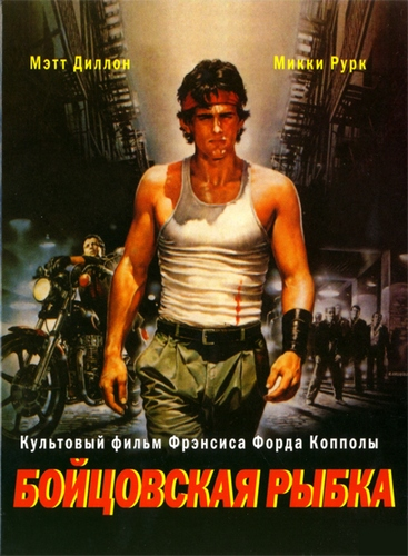 Бойцовая рыбка / Ruble fish. США, 1983. Режиссер Френсис Форд Коппола. Актеры: М. Диллон, М. Рурк, В. Спано, Д. Хоппер, Д. Лэйн и др. В своеобразном продолжении "Аутсайдеров" - ностальгичной "Бойцовой рыбке" Коппола ("Крестный отец", "Апокалипсис сегодня") обратился к традициям молодежного кино 1960-х, к стилистике черно-белых фильмов о летящих на мотоциклах парнях, об их неприкаянности, одиночестве, поисках любви, дружбы и смысла жизни... Замечательная игра Микки Рурка, Мэта Дилона и Дэнниса Хоппера (того самого, что поставил "Беспечного ездока", ставшего символом молодежного протеста 1960-х), филигранная режиссура придавали фильму притягательную силу. Микки Рурк ("9 1/2 недель", "Сердце ангела") сыграл здесь роль бывшего "беспечного ездока" - старшего брата главного героя. Все его жизненные иллюзии уже преодолены. Всё уже в прошлом. Всё - позади... Хорош был и оригинальный цветовой спецэффект: в черно-белом фильме появлялся неожиданный ярко-красный символ: аквариумные рыбки, беспомощ