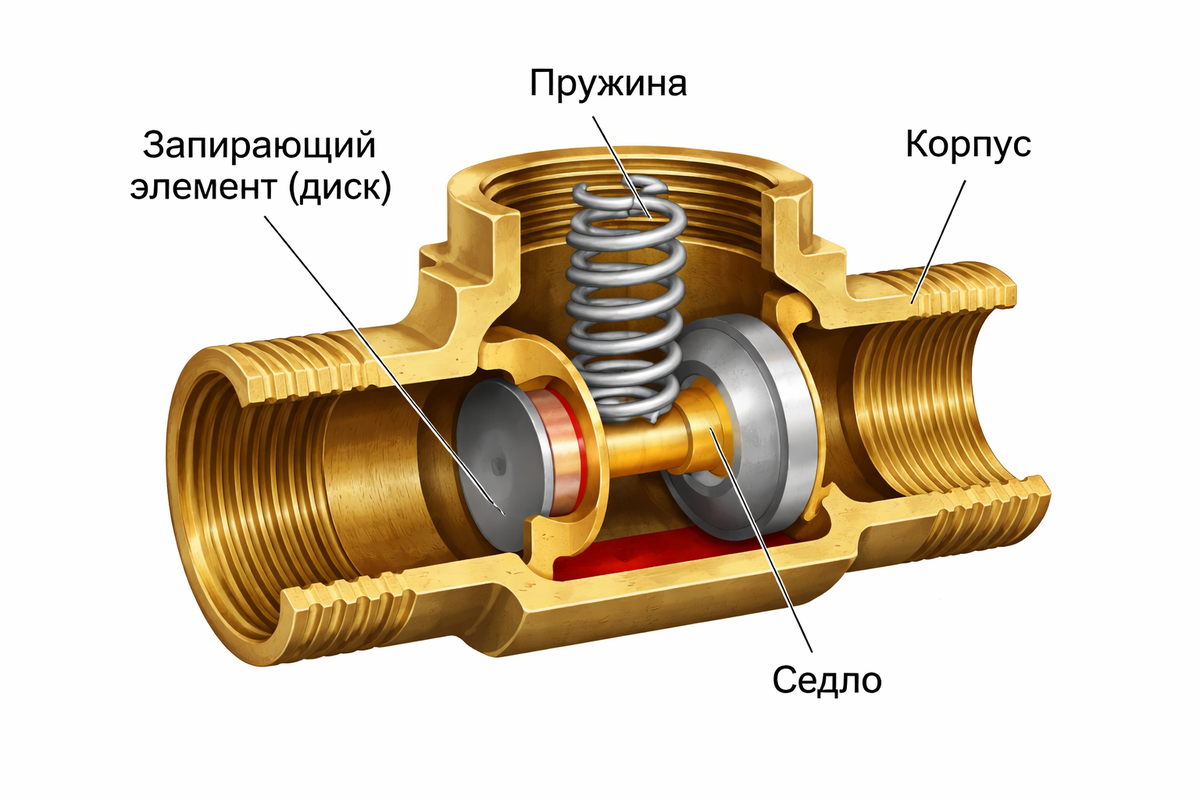 Никаких “поднимает давление” и “улучшает напор”. Он просто удерживает столб воды/теплоносителя и защищает систему от обратного потока при остановке насоса или перепадах давления. Без клапана получаете: Внутри корпус, седло и запирающий элемент (диск/тарелка/шар). Поток давит правильно, клапан открыв