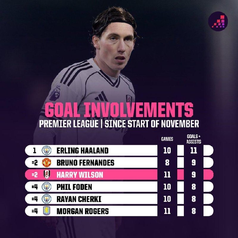 С начала ноября только Эрлинг Холанд совершил результативных действий в Премьер-Лиге больше, чем Харри Уилсон 🤌