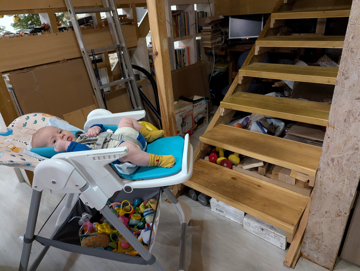 Почему я не взяла эту вещь раньше, не с четырех месяцев, а с рождения? Ведь стульчик можно разложить практически в лежачее положение и таскать за собой всюду. Вот я, например, привезла Женьку, чтоб найти под лестницей плитку - я ее давно уже для кухни закупила, пришла пора наконец ее приклеить.