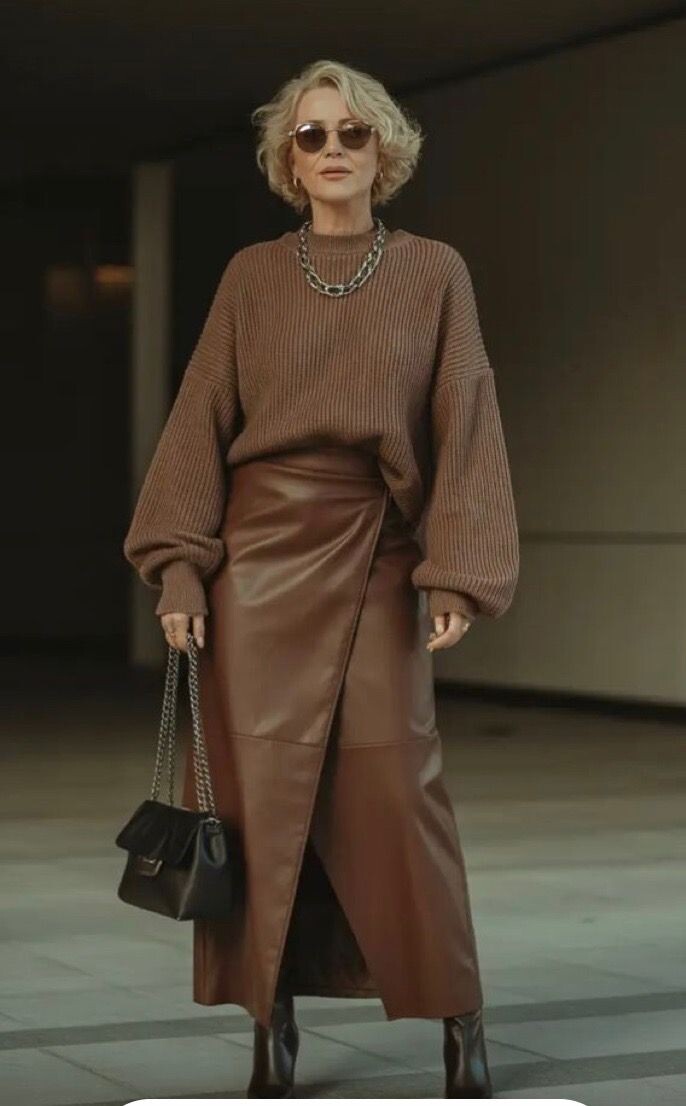 На самом деле, это достаточно просто – производить на окружающих впечатляющий ВАУ-эффект. Такое эффект обеспечит грамотно подобранная цветовая гамма, интересные и оригинальные вещи и выбор для гардероба только той одежды, которая хорошо сидит на фигуре и подчеркивает привлекательность своей владелицы. 1. Шоколадно-коричневая кожаная юбка на запах может использоваться для формирования стильного ансамбля с вязаным коричневым джемпером свободного кроя, с широкими рукавами и сниженной линией плеч, заправленным за пояс юбки. Тотал-лук гармонично дополняют высокие коричневые кожаные сапоги и контрастно более темная дамская сумочка. 2. Прямые классические бежево-кофейные брюки укороченного фасона и светло-бежевый лаконичный джемпер – основа интересного монохромного образа в бежево-коричневой цветовой гамме. Дополнить и завершить такой образ помогает оригинальное укороченное пальто с бахромой по манжетам и низу, а также тяжелые ботинки кофейного оттенка с белыми вставками. Не лишними деталями