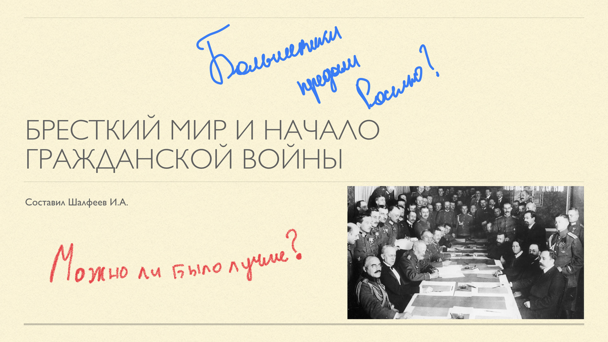 Сами условия в тексте повторять не будем — на слайде и так видно, что они удручающие. Впрочем, сам по себе аргумент "сдержали обещание — прекратили войну" в принципе в пользу большевиков всё ещё работал.