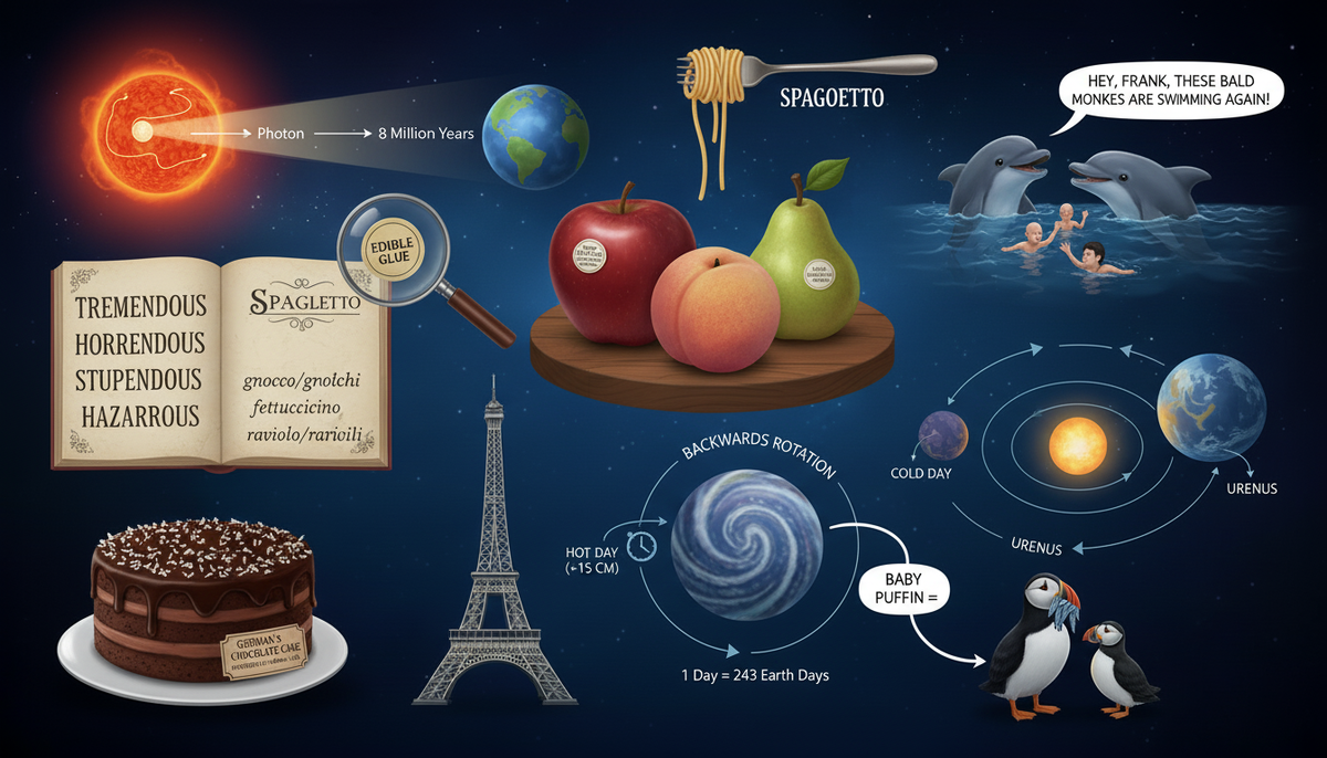 Мир вокруг нас — это удивительная смесь космических чудес, языковых загадок и бытовых мелочей, о которых мы даже не задумываемся. Всё — от древнего света, щекочущего наши глаза, до названий пасты и поведения дельфинов — хранит в себе удивительные истории. Погрузитесь в этот калейдоскоп любопытных фактов, где наука переплетается с повседневностью, а обыденное оказывается необычным. Фотону, самой элементарной частице света, может понадобиться от тысяч до миллионов лет, чтобы преодолеть путь от ядра Солнца до его поверхности. Однако как только он вырвется наружу, ему требуется всего 500 секунд — около 8 минут 20 секунд — чтобы достичь Земли и попасть прямо вам в глаз. Получается, что солнечный свет, который мы видим сегодня, начал своё путешествие задолго до появления человечества — он по-настоящему древний. В английском языке существует всего четыре слова, заканчивающихся на «-dous»: tremendous, horrendous, stupendous и hazardous. По звучанию — будто строгий отзыв учителя о школьных успе
