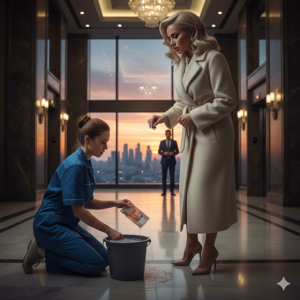 Вечерний элитный жилой комплекс «Атлант» дышал холодной, стерильной роскошью. Это было здание из стекла и стали, где воздух был отфильтрован дорогими системами кондиционирования, а тишину нарушал лишь тихий гул лифтов. Здесь не жили обычные люди — здесь обитали те, кто привык смотреть на город с высоты птичьего полета. Вера, затянув густые каштановые волосы в тугой, почти болезненный узел и надев безликую синюю форму с логотипом клининговой компании, методично протирала мраморный пол в холле тридцатого этажа.