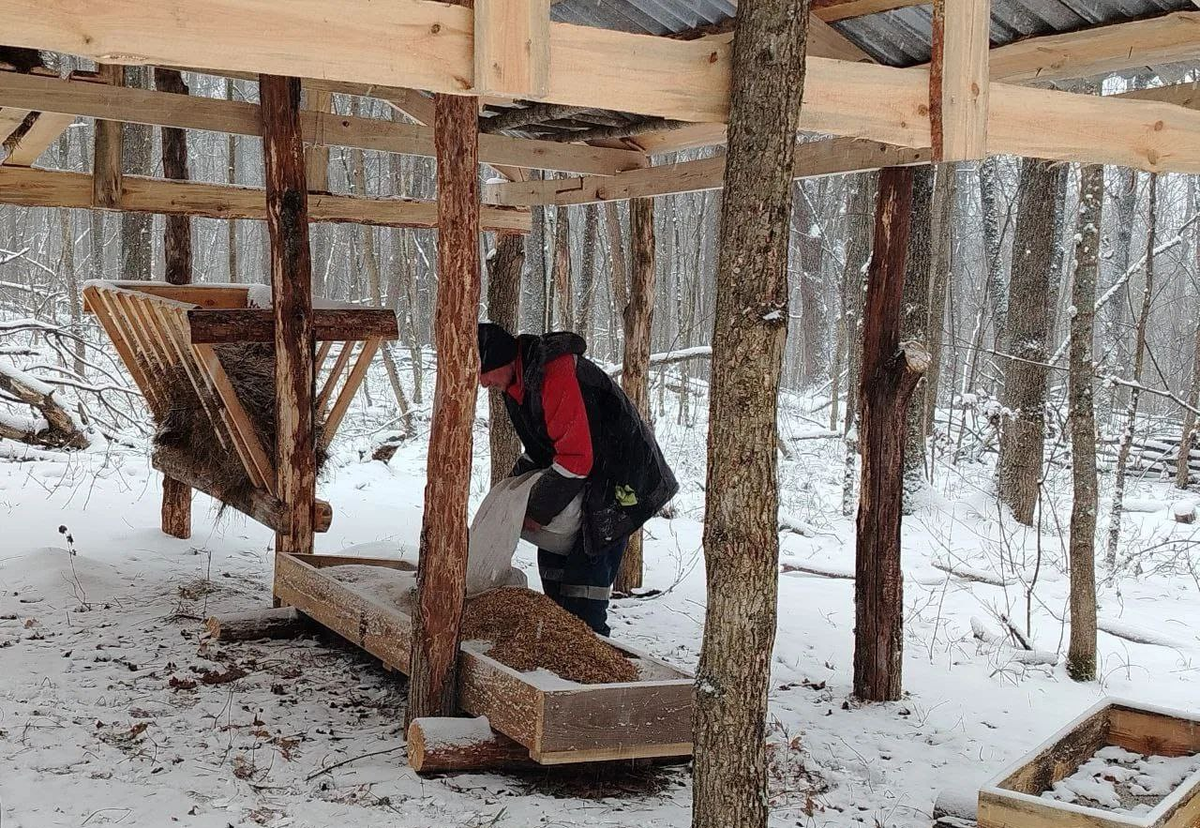 Сотрудники Экоохотнадзора организовали зимнюю подкормку животных в заказнике «Мандровский». В рацион вошли кукуруза, отходы зерновых и витаминные веники из крапивы с солью. Такая помощь помогает животным пережить зиму, когда сложно искать еду.