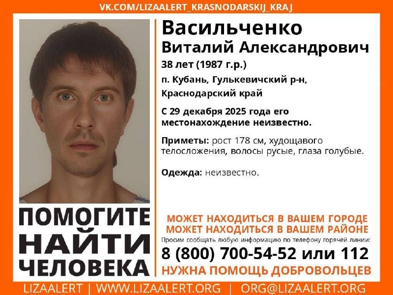 #Пропал #Васильченко Виталий Александрович, 38 лет (1987 г.р.) п. #Кубань, #Гулькевичский р-н, #Краснодарский край С 29 декабря 2025 года его местонахождение неизвестно. Приметы:рост 178 см, худощавого телосложения, волосы русые, глаза голубые. Был одет: неизвестно. _____ Инфорг: Умка93 (Ольга) 89384231455 Горячая линия отряда: 8 800 700 5452 (звонок бесплатный)