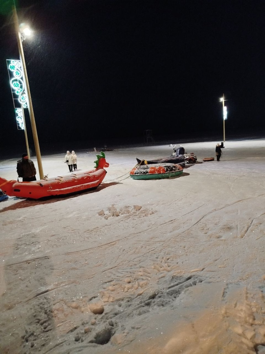 Катались на таких штуках, садишься внутрь любой фигурки, у нас дракон был, и к снегоходу привязывается, и мужчина, который управляет