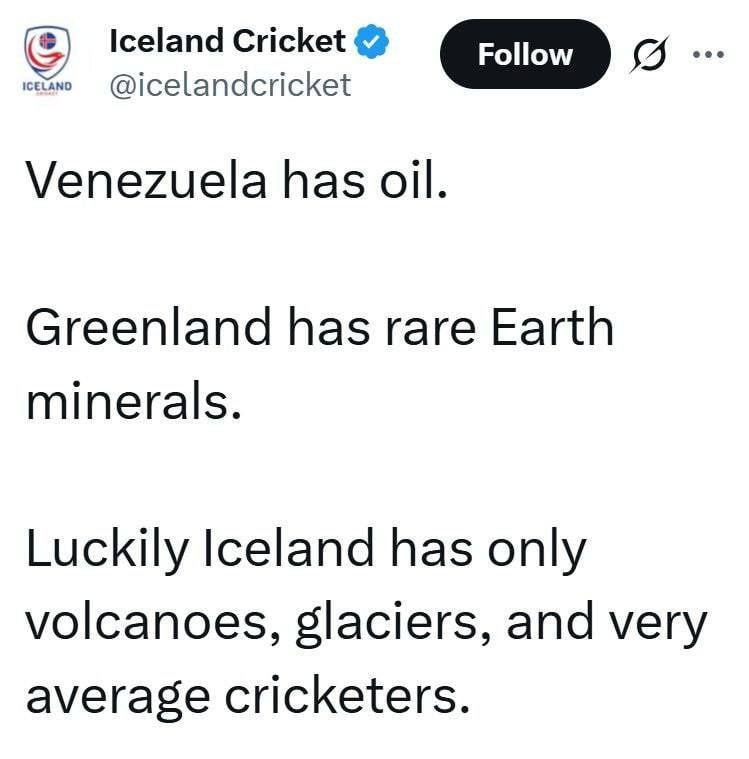 «У Венесуэлы — нефть, у Гренландии — редкоземы. Слава богу, в Исландии нет ничего, кроме вулканов, ледников и посредственных игроков в крикет», — заявили в Исландской ассоциации крикета. Подписаться на канал | 📲 MAX Мы в ВКонтакте