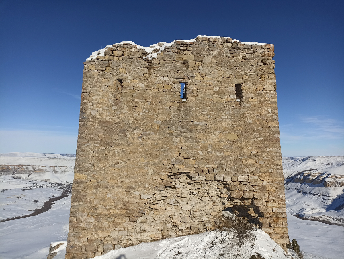 Цель: она контролировала долину реки Джегуты и важные пути. Вход, расположенный на высоте 5,5 метров (попасть внутрь можно было только по приставной лестнице), говорит о её сугубо оборонительном характере. Сейчас в башню можно попасть в дыру в стене. Правда, ползком. Виды открываются потрясающие. А нам ещё и с погодой повезло. Впервые для науки башню описал в XIX веке караимский учёный Авраам Фиркович, путешествовавший по Кавказу.