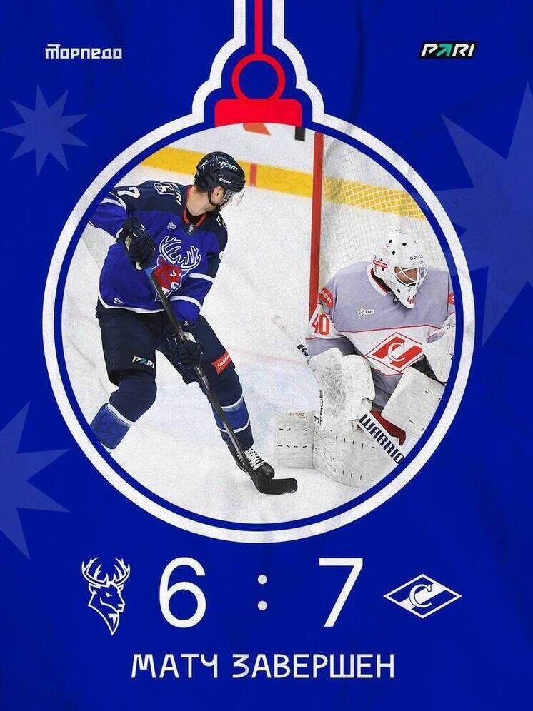 Хоккеисты «Торпедо» и «Спартака» устроили настоящий праздник для любителей хоккея. 13 заброшенных шайб, но счет, увы, не в пользу нижегородцев — 6:7. «Красно-белые» два раза по ходу встречи отыгрывались, уступая в две шайбы. Сначала со счета 2:0 в пользу «Автозаводцев», позже со счета 4:2. Когда на табло «горело» 6:6, все решила заброшенная шайба «Спартака» в большинстве. У «Торпедо» же отметились Василий Атанасов (дважды), Антон Сизов, Максим Летунов, Егор Виноградов и Даниил Журавлев. 6 января команда Алексея Исакова дома примет «Барыс».