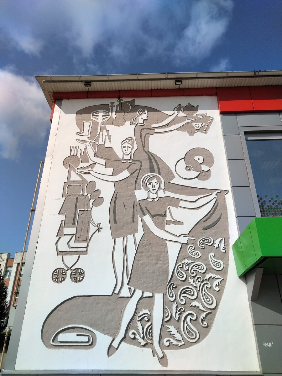 Старое здание универмага с модернистским панно примерно 60-х - 70-х годов.