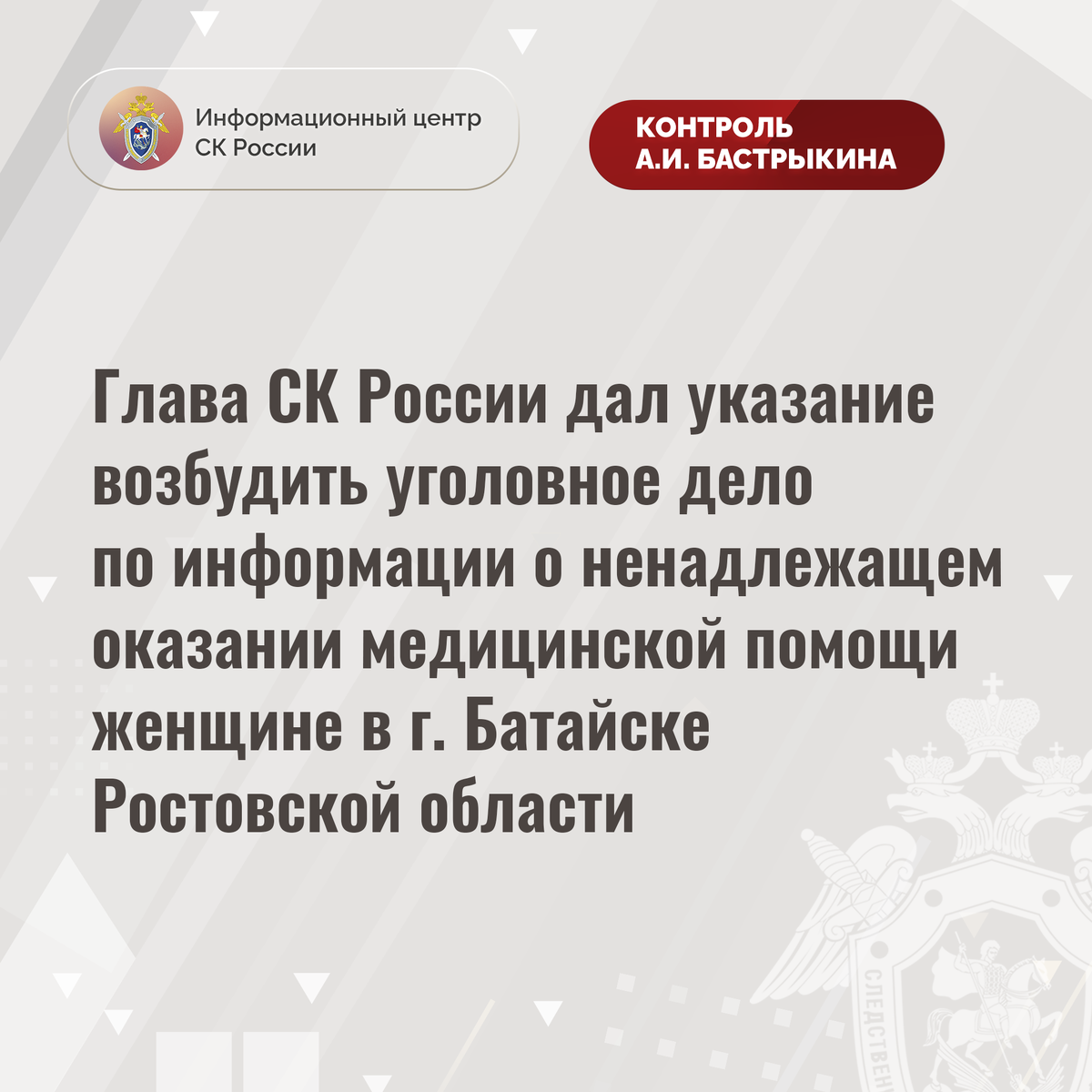 Глава СК России дал указание возбудить уголовное дело по информации о ненадлежащем оказании медицинской помощи женщине в г. Батайске