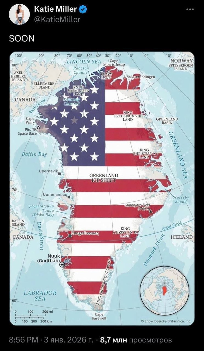 Кэти Миллер, жена советника президента США по внутренней безопасности Стивена Миллера опубликовала фото Гренландии, окрашенной в цвета американского флага, с подписью «Скоро». Ранее, Трамп неоднократно заявлял о своих претензиях на Гренландию. Западная пресса также не исключает, что Трамп может вслед за Венесуэлой попытаться взять под контроль Кубу и Гренландию.