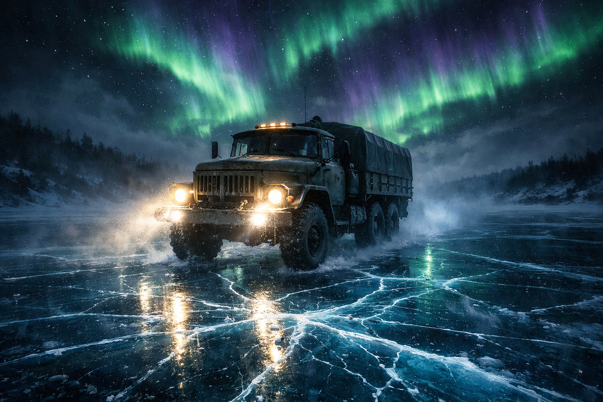 Под мистическим переливом полярного сияния лучи фар выхватывают из чернильной тьмы паутину трещин, похожих на вздувшиеся вены реки. Мотор натужно гудит, сопротивляясь морозу. Водитель, поглаживая ледяной руль словно живое существо, едва слышно шепчет в пустоту: «Ещё разок, брат, последний». Впереди — лишь белое безмолвие и риск, от которого стынет кровь.