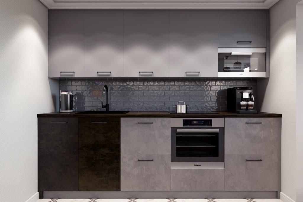 Монохромный цвет кухонных фасадов. Три вида кухонных фасадов с текстурами глянцевой керамики и металла, органично слились в оригинальную композицию.