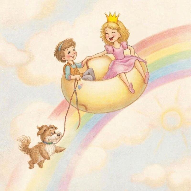 Айлин — наследная принцесса Мурляндии. По законам Мурляндии все наследные принцессы заступают на трон только после своего совершеннолетия. А пока Айлин живет в маленьком домике на берегу озера, ходит в школу принцесс, а по вечерам играет с деревенскими ребятишками в догонялки. И тогда, только по съехавшей на бок желтой фетровой короне можно понять, что Айлин — принцесса. Но корона все-таки есть. И однажды Айлин даже издала шутейный принцессный Указ о том, что всем гражданам Мурляндии при встрече нужно непременно здороваться с лягушками, потому что они не противные, а просто лягушки. Конечно, юридической силы этот Указ не имел, но все жители Мурляндии его выполняли и с удовольствием здоровались со всеми первовстречными лягушками, потому что это было весело. А однажды Айлин заболела. — Привет! Чего это ты разлеглась тут на траве прямо? — запыхавшийся Николя присел рядом с Айлин и с удивлением ее разглядывал. — Мы же договаривались по радуге сегодня кататься. Бабушка и ватрушку для этого