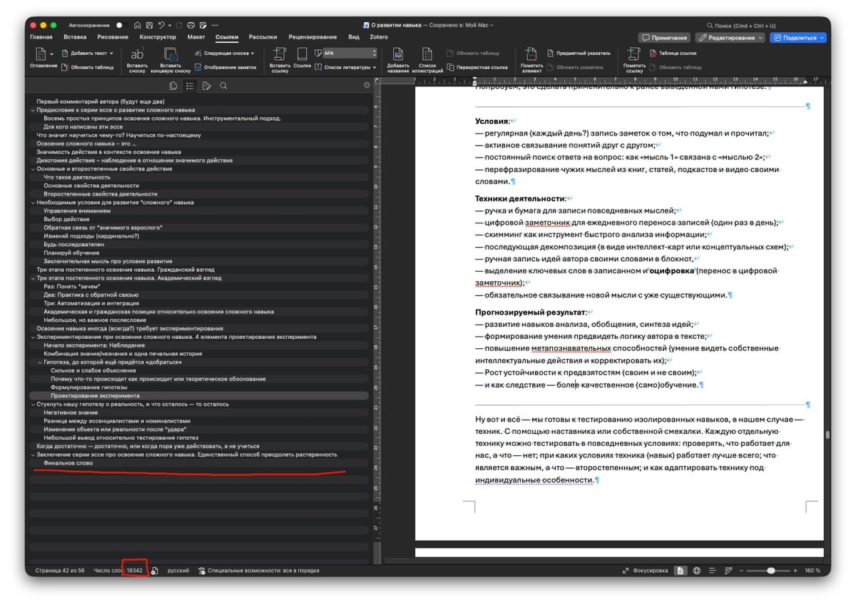 … Перед Новым годом я начал возиться с рукописью книги “Об освоении сложного навыка”, название пока рабочее. Потребовалось всего 30 с небольшим часов, чтобы перенести 14 эссе в формат, требуемый издателем. Вся серия получилась очень неплохой: глубокой, философской, методической и методологической. Работая над рукописью, я много рефлексировал о проделанной работе, и вот что хочу сказать… Написание этой книги (14 эссе уже превратились в книгу) стало возможно лишь благодаря владению техниками “нечтения” и системе заметковедения, которые сплелись у меня в систему работы с информацией. Если бы мне кто-то сказал, что я вот так вот смогу “быстро” выдавать книги (три книги за три года), то я бы усмехнулся. Мне, кстати, недавно сказали, что моя продуктивность не уступает продуктивности Лумана. Я с этим утверждением не очень согласен, но тем не менее, нельзя не отметить тот факт, что помимо книги я еще написал пару-тройку статей, из которых одну опубликовали, а две другие ждут своего часа (в