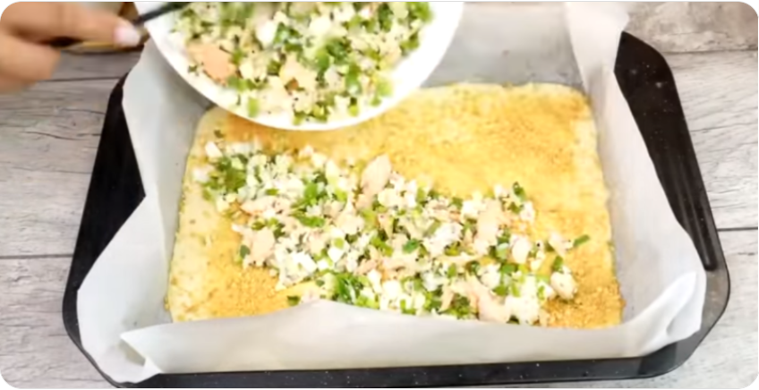 Достаньте форму, выложите начинку, залейте оставшимся тестом. Выпекайте 25-30 минут при той же температуре.